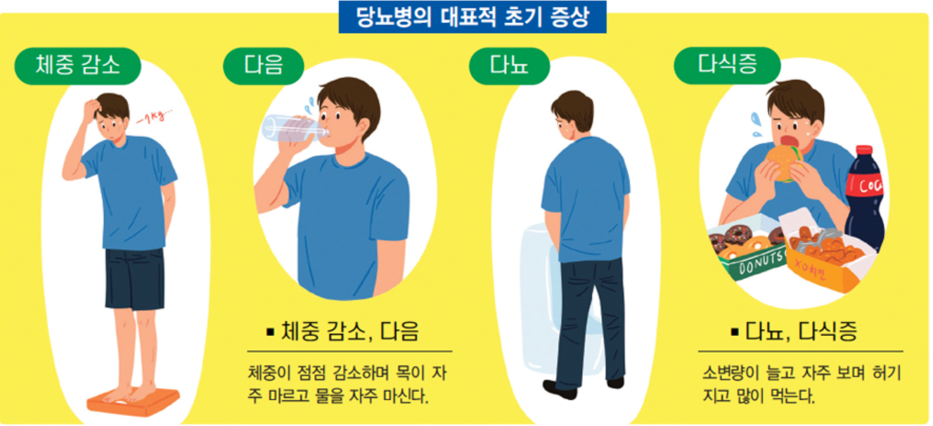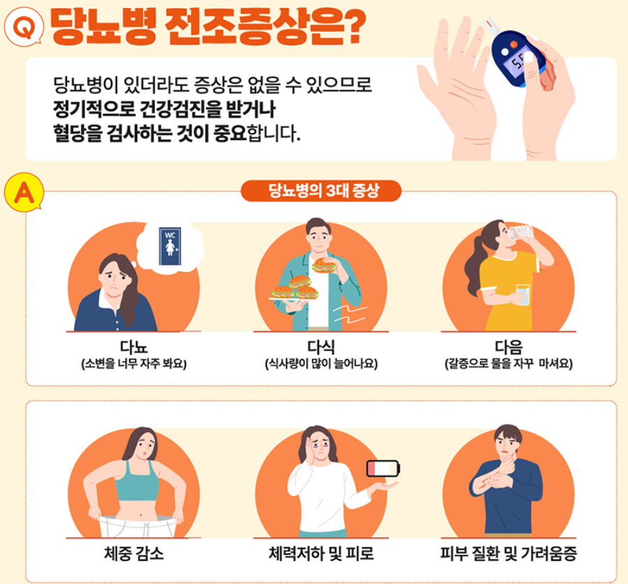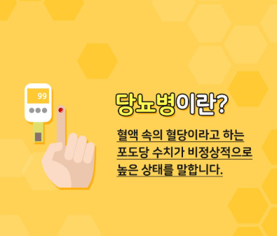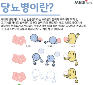 당뇨병은 소변으로 포도당이 배출되는 질환으로, 췌장에서 분비되는 인슐린이 부족하거나 기능이 떨어져 혈당 조절이 되지 않는 상태입니다.